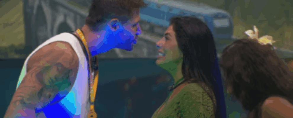 Homem com tatuagens e medalha discute com mulher em reality show, com outra mulher ao fundo.