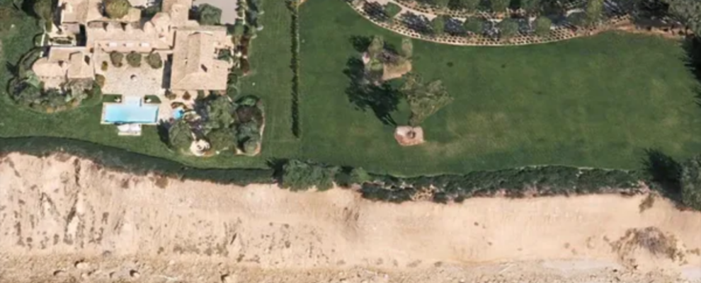 Vista aérea de uma mansão luxuosa com piscina, gramado e praia ao lado.