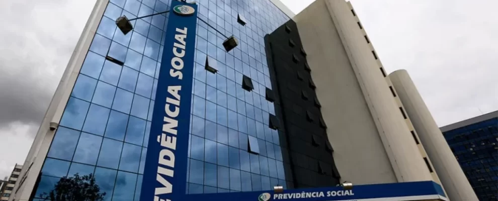 Prédio moderno com fachada espelhada e letreiro 'PREVIDÊNCIA SOCIAL' em azul. Instituto Nacional do Seguro Social.