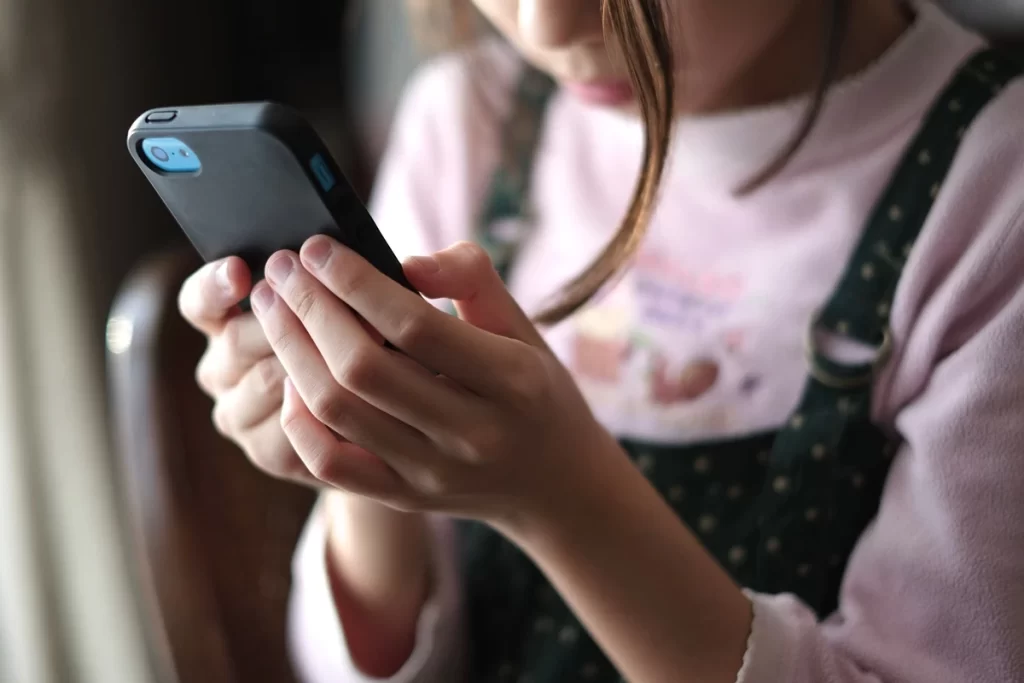 Close-up de mãos de criança usando um smartphone, com foco no aparelho e nos dedos que interagem com a tela.
