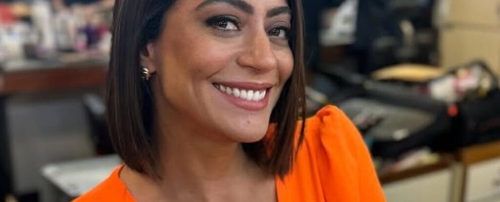A mulher sorri para a câmera, usando um vestido laranja vibrante. Ela tem cabelo castanho escuro e usa brincos dourados.