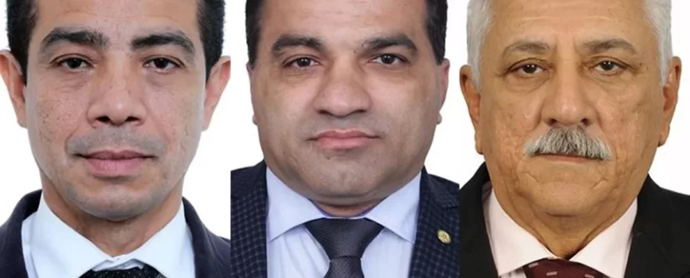 Três homens de terno e gravata, em um retrato oficial com fundo branco. São eles: um homem com pele morena e cabelo preto, u…
