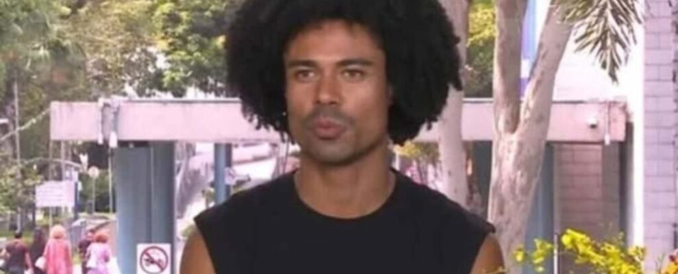 Homem com cabelo afro e camiseta preta em frente a um fundo desfocado com pessoas e folhagens.
