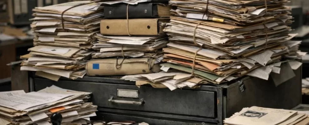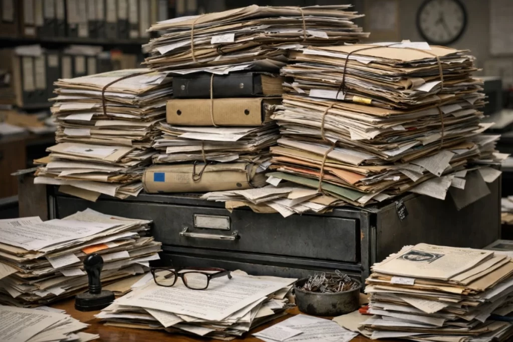 Pilhas de documentos antigos e papéis amarelados empilhados em uma mesa de escritório, com óculos e carimbo.