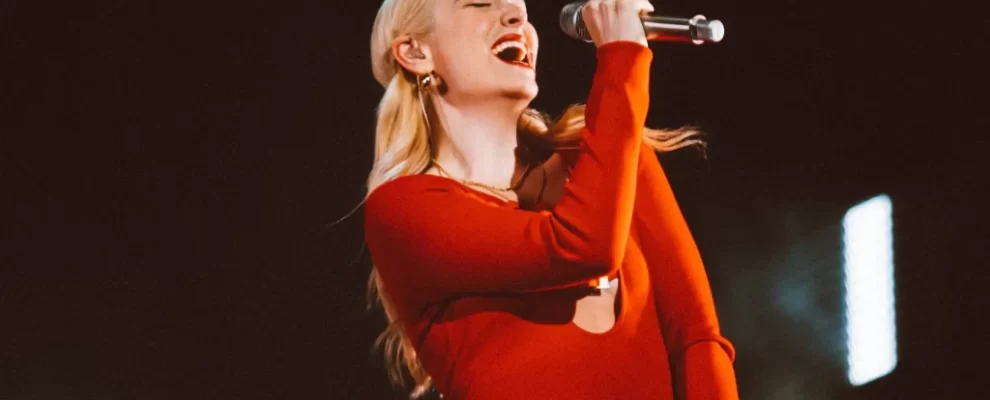 Cantora Lorde em palco, vestindo um vestido vermelho e cantando ao microfone com os olhos fechados e um sorriso.