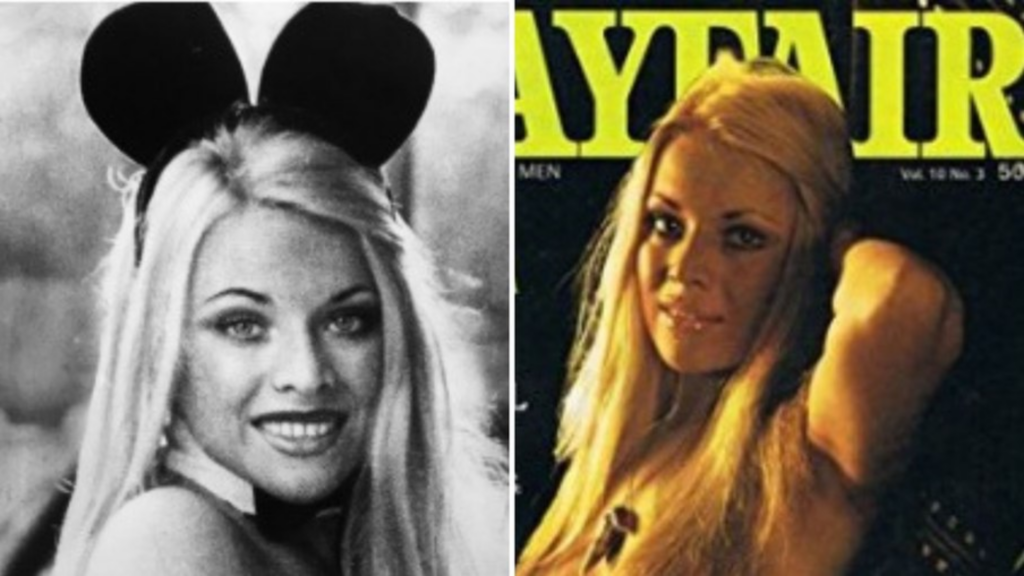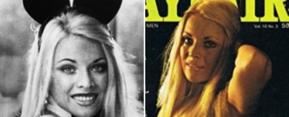 Pamela Anderson em duas fotos, uma com orelhas de coelho e outra na capa da revista Playboy.