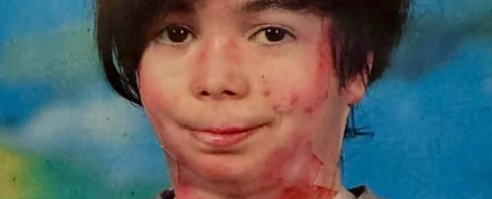 Retrato de criança com ferimentos visíveis no rosto e pescoço, com fundo azul e verde.