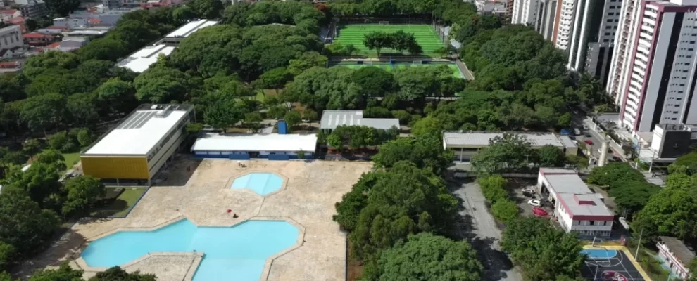 Vista aérea de um complexo esportivo com piscina, quadra de futebol e prédios em meio a árvores e edifícios altos.