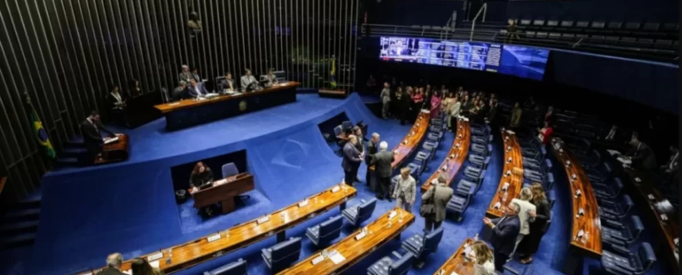 Senadores em plenário no Congresso Nacional, em Brasília. O plenário é azul e tem assentos em formato de ferradura.