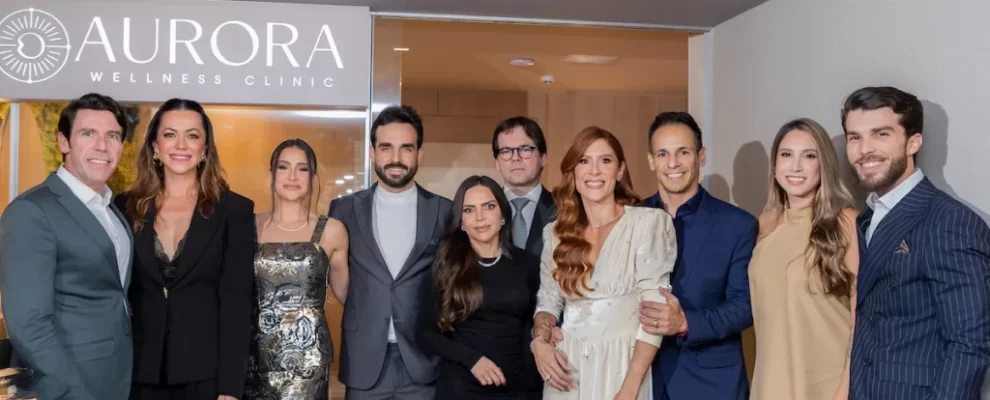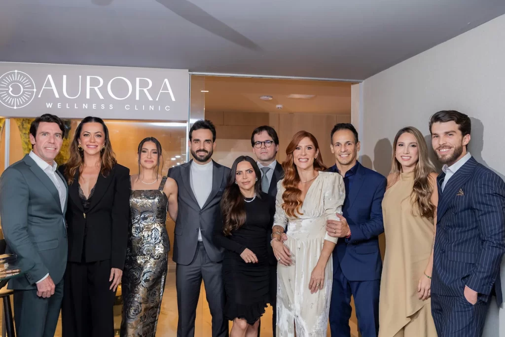 Grupo de pessoas posa em frente à clínica Aurora Wellness Clinic. Homens e mulheres vestem trajes sociais e elegantes.