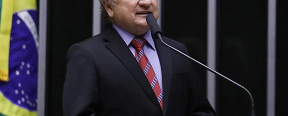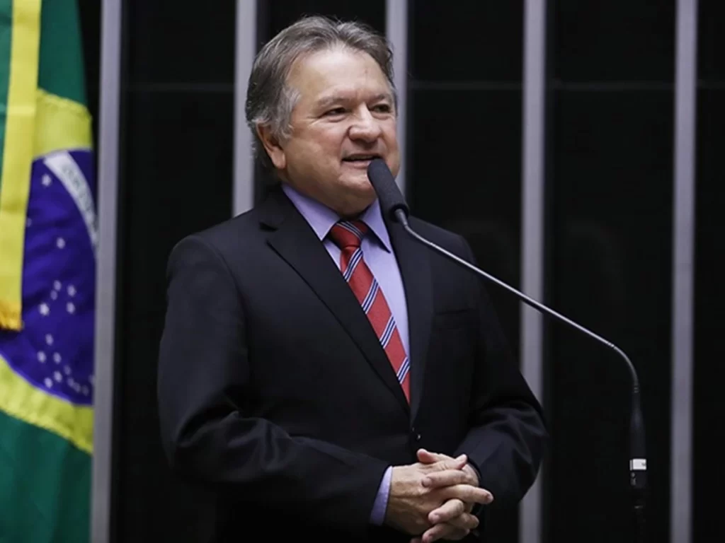 Político brasileiro em terno e gravata fala em microfone ao lado da bandeira do Brasil em evento oficial.