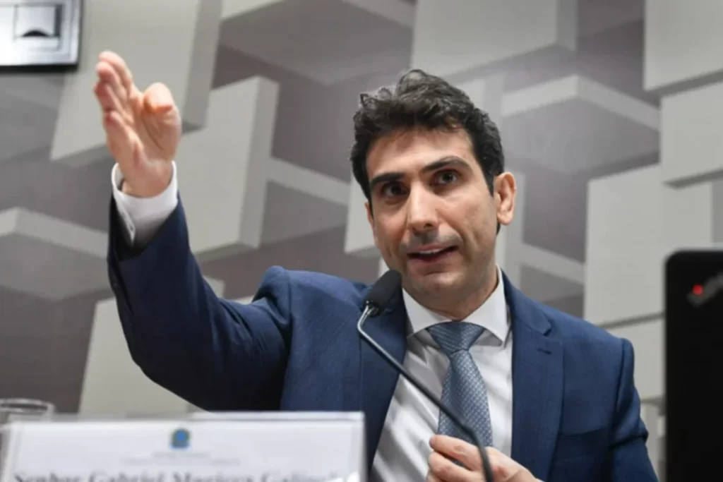 Senador Gabriel M. Galipoli discursa em evento oficial, com microfone à frente e gesto com a mão levantada. Imagem em ambien…