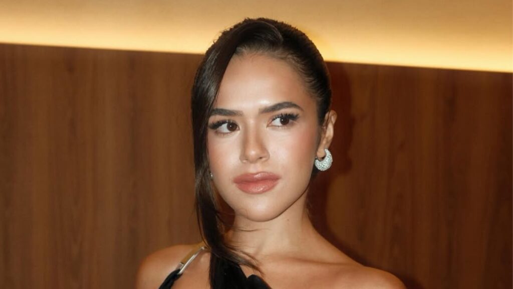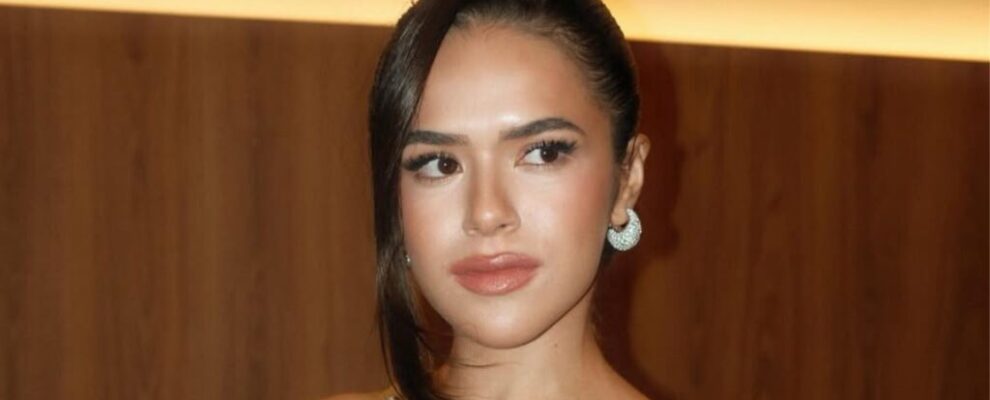 Atriz Bruna Marquezine posa para fotos com look elegante e maquiagem marcante em evento.