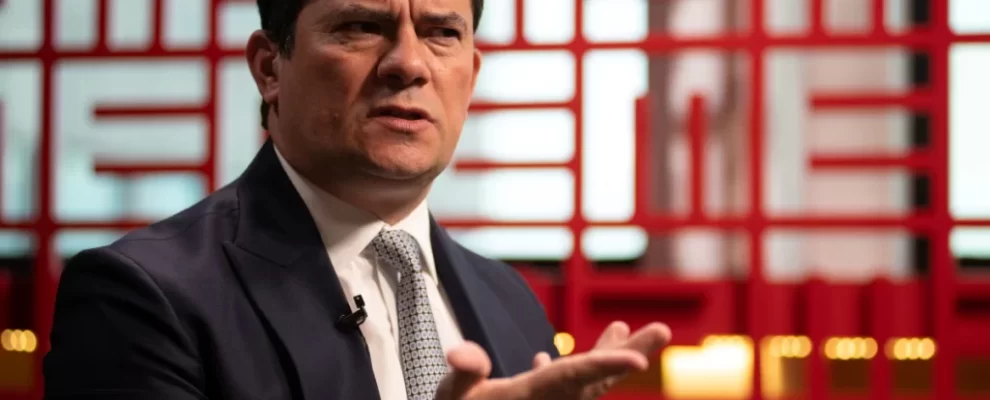 Sérgio Moro, político brasileiro, em entrevista com terno azul escuro e gravata, gesticulando com as mãos. Ao fundo, um pain…