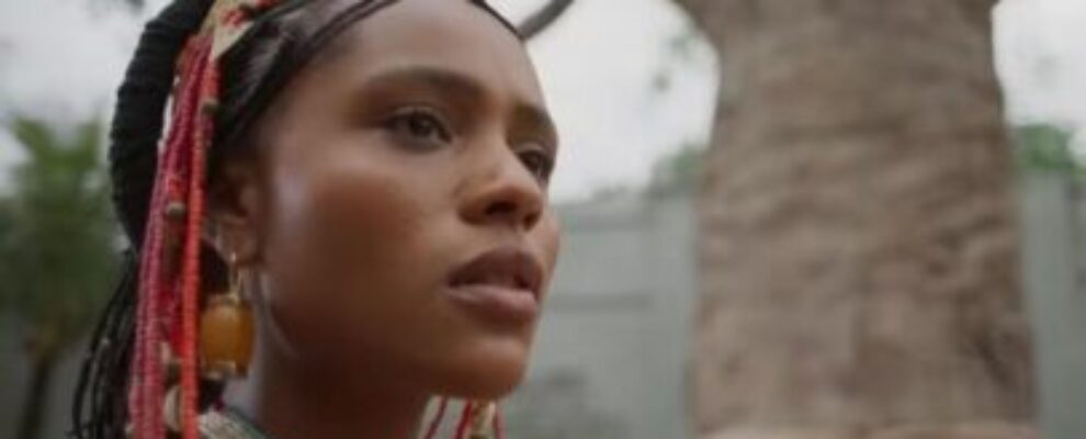 Mulher com tranças e adornos, em frente a uma árvore de baobá. Cena de filme ou série.