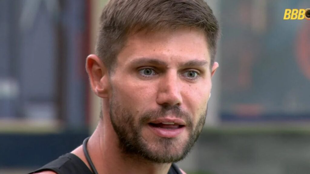 Homem com barba e cabelo curto, olhando para o lado com expressão surpresa. Logo do BBB ao fundo.