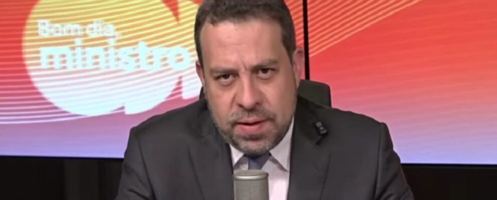 Homem de terno e gravata em frente a um microfone, com um logo "Bom dia, Ministro" ao fundo.