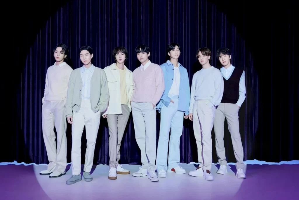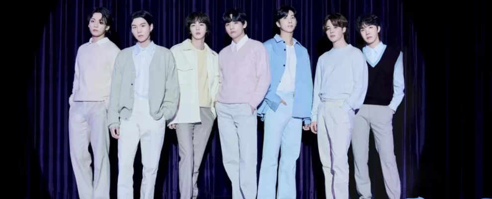 O grupo BTS posa em frente a uma cortina roxa, vestindo roupas em tons pastel e neutros. Da esquerda para a direita: Jungkoo…