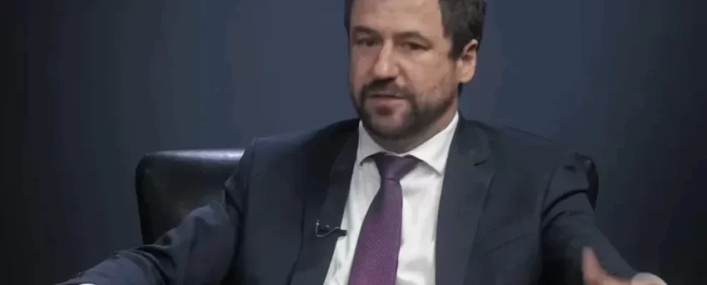 Homem de terno escuro e gravata roxa, sentado em uma poltrona de couro, em um estúdio com fundo escuro.
