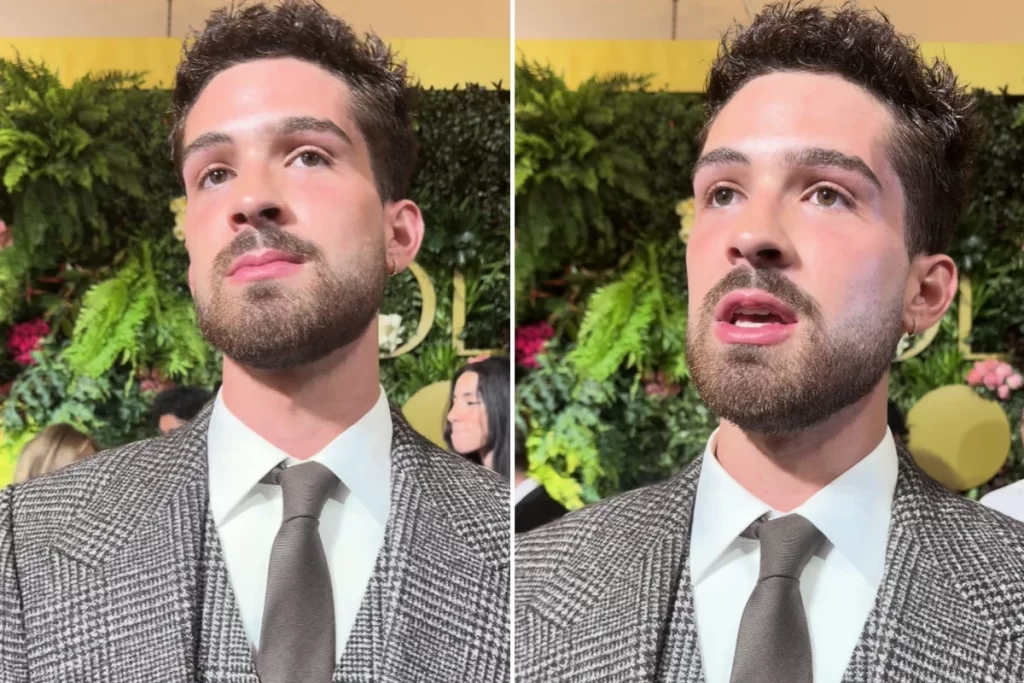 Ator Gabriel Santana em evento com fundo de folhagens verdes e detalhes dourados, vestindo terno xadrez.