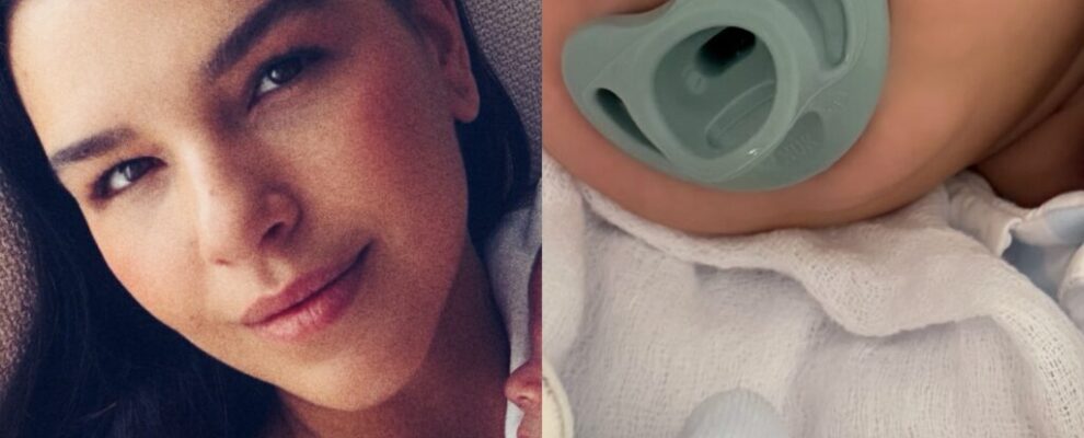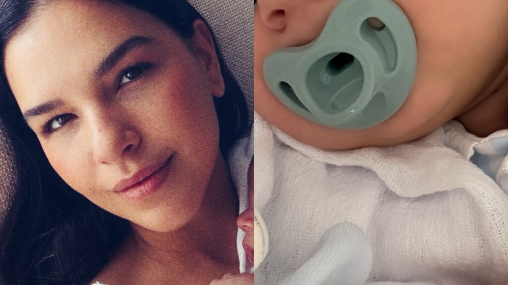 Atriz Isis Valverde posa para selfie ao lado de seu bebê, que aparece com chupeta azul clara.