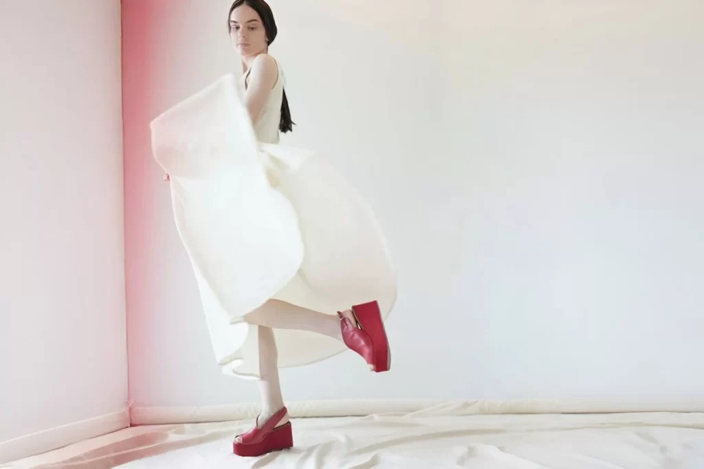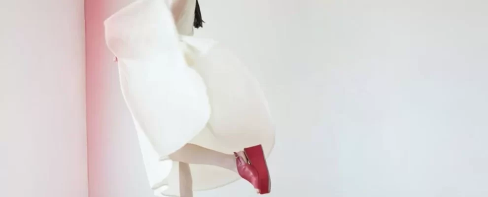 Modelo em estúdio com vestido branco esvoaçante e sapatos vermelhos de plataforma, em pose dinâmica.