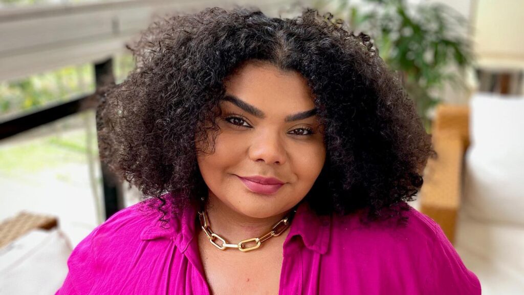 Mulher com cabelo cacheado e escuro, usando um colar dourado e uma blusa rosa vibrante, sorri para a câmera em um ambiente i…