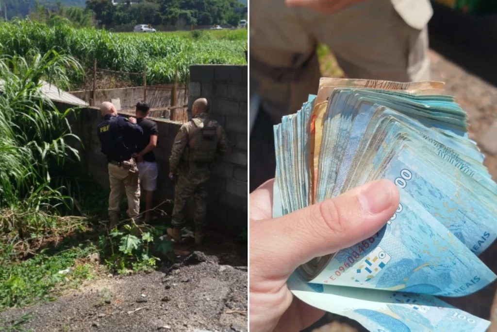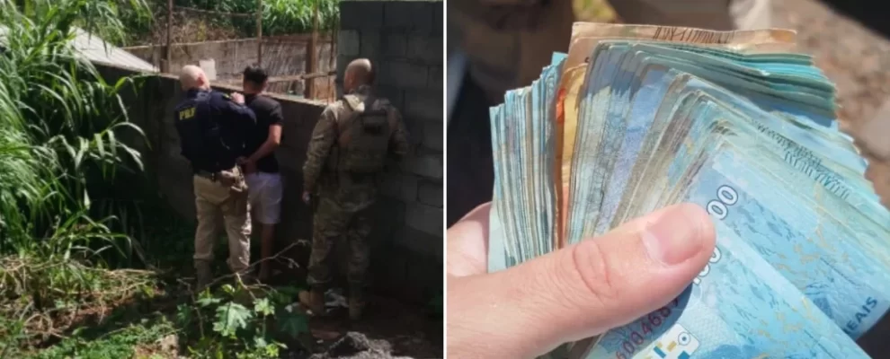 Policial federal prende homem algemado ao lado de muro, enquanto outro policial observa. Em outra imagem, mão exibe maço de …