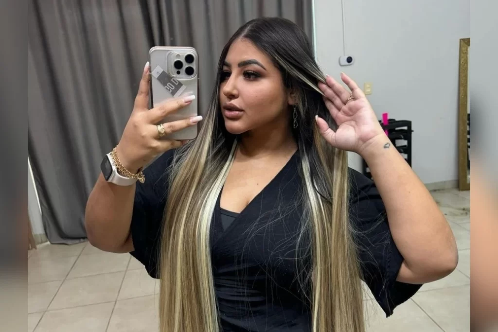 Mulher tira selfie no espelho com cabelo longo e loiro, usando blusa preta e joias. Ela está em um salão de beleza.
