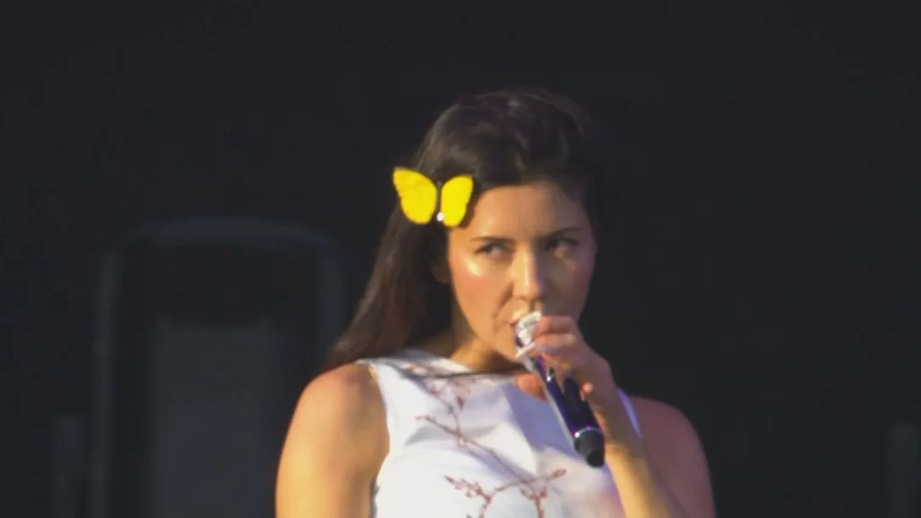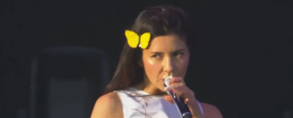 Marina Diamandis, conhecida como MARINA, canta em um show com uma borboleta amarela no cabelo e um vestido branco com estamp…