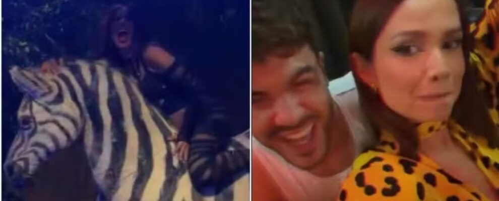 Anitta em cima de zebra cenográfica e Bruna Marquezine com amigo em festa. Imagens de eventos distintos.