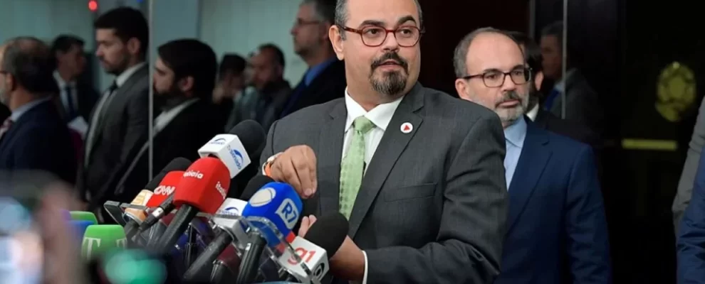 Homem de terno cinza com óculos vermelhos e barba fala em microfones de diversas emissoras de TV. Ao fundo, outros homens em…