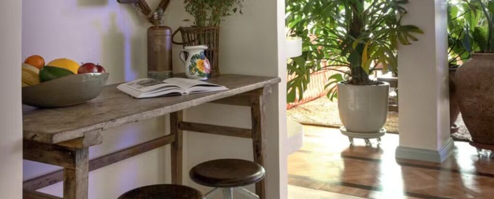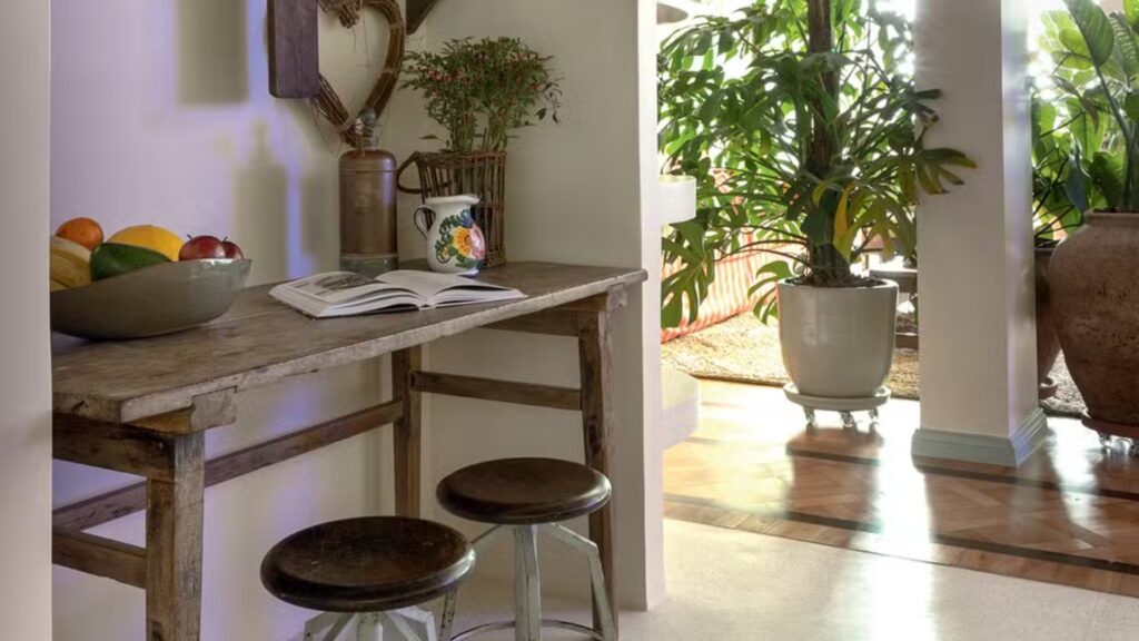 Mesa rústica com fruteira, jarra decorativa e banquinhos, ao lado de plantas em vasos grandes em ambiente interno.