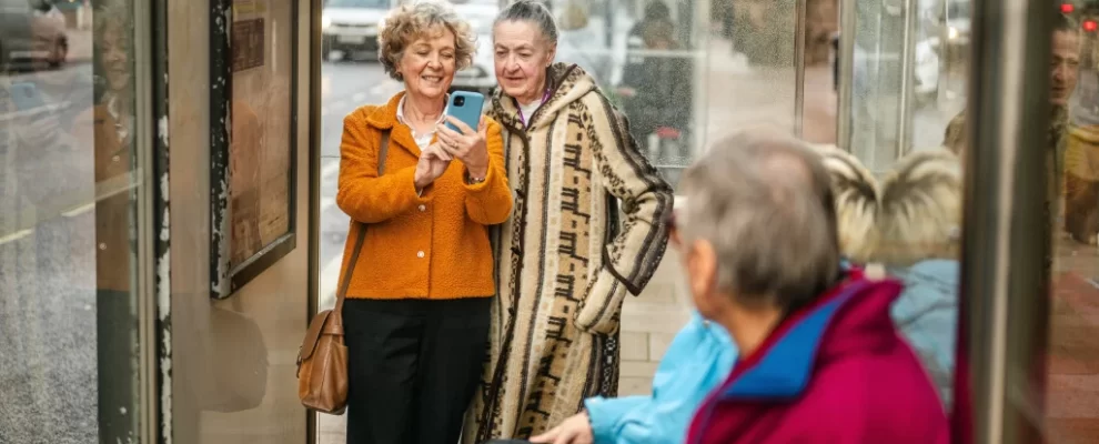 Duas mulheres idosas sorriem enquanto olham para um celular em um ponto de ônibus. Uma delas usa um casaco laranja e a outra…