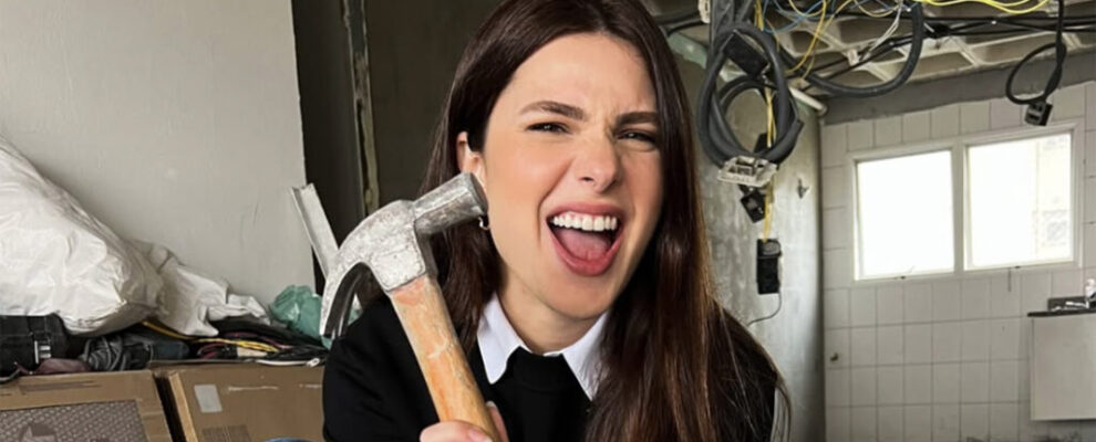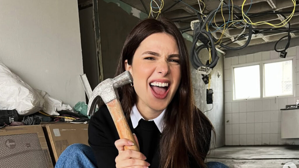 Bruna Marquezine segura um martelo com expressão animada em obra, com fios expostos e paredes em reforma ao fundo.