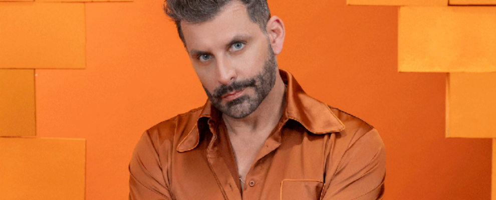 Homem com barba e cabelo escuro, vestindo camisa marrom, posa em frente a um fundo laranja com blocos.