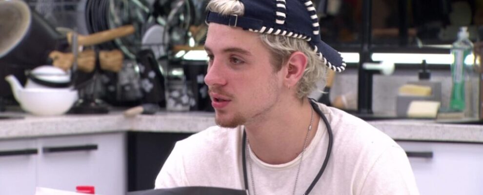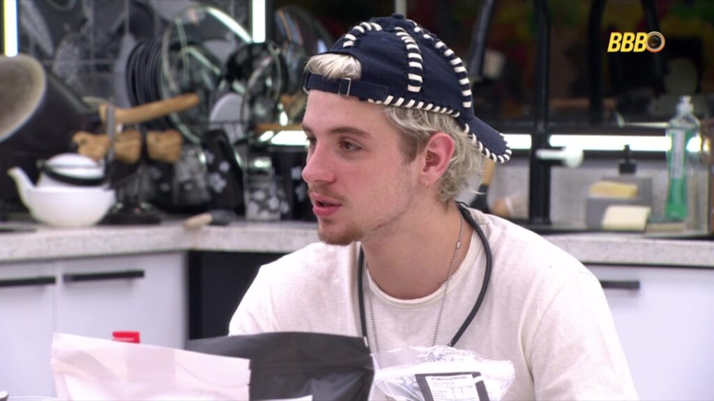 Participante do BBB 23, Gabriel Santana, usa boné e camiseta branca em cozinha. Ao fundo, objetos e logo do programa.