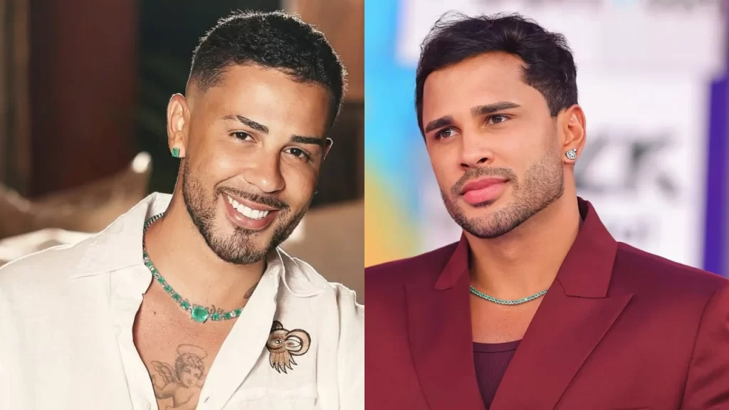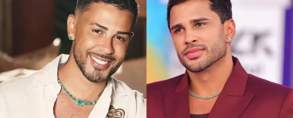 Montagem com fotos de MC Ryan SP e Lucas Guimarães, ambos sorrindo e usando joias.