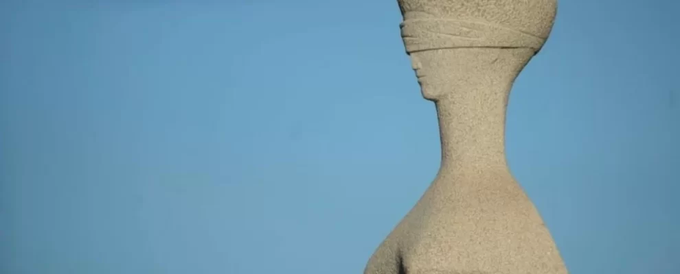 Estátua da Justiça vendada, símbolo do Supremo Tribunal Federal (STF) em Brasília, contra um céu azul claro.
