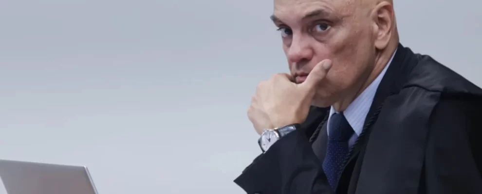 Alexandre de Moraes, ministro do STF, pensativo em seu gabinete. Ele usa toga preta e gravata azul.