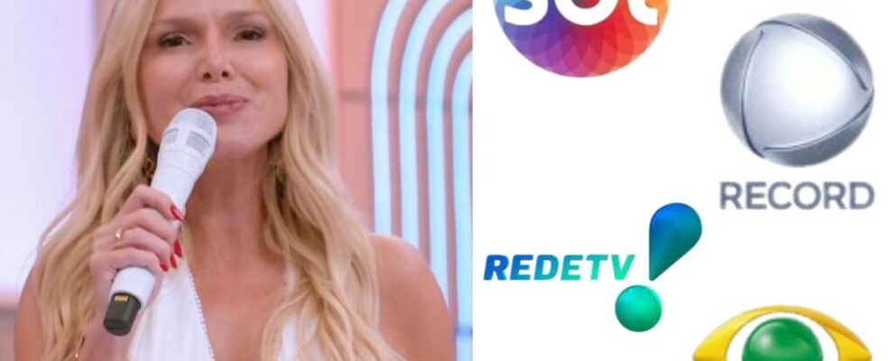 Apresentadora Eliana com microfone e logos das emissoras SBT, Record, RedeTV! e Band ao lado.