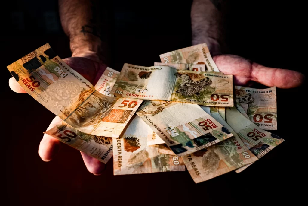 Mãos segurando várias notas de 50 reais, com foco nas cédulas e no dinheiro.