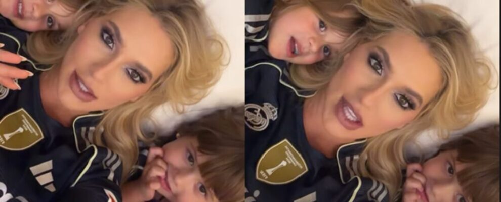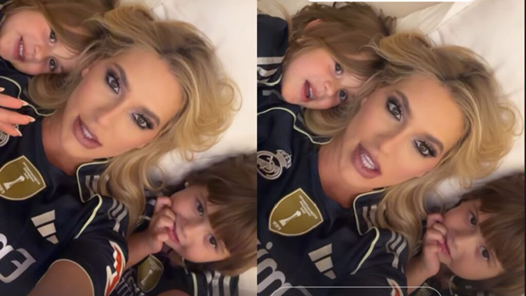 Georgina Rodríguez e filhos deitados na cama, usando camisas de time de futebol, em momento de carinho.
