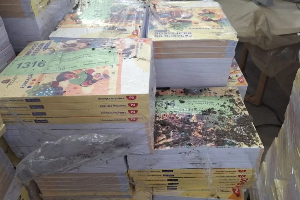 Pilhas de cadernos infantis e para professores, alguns danificados por sujeira e umidade, em São Paulo.