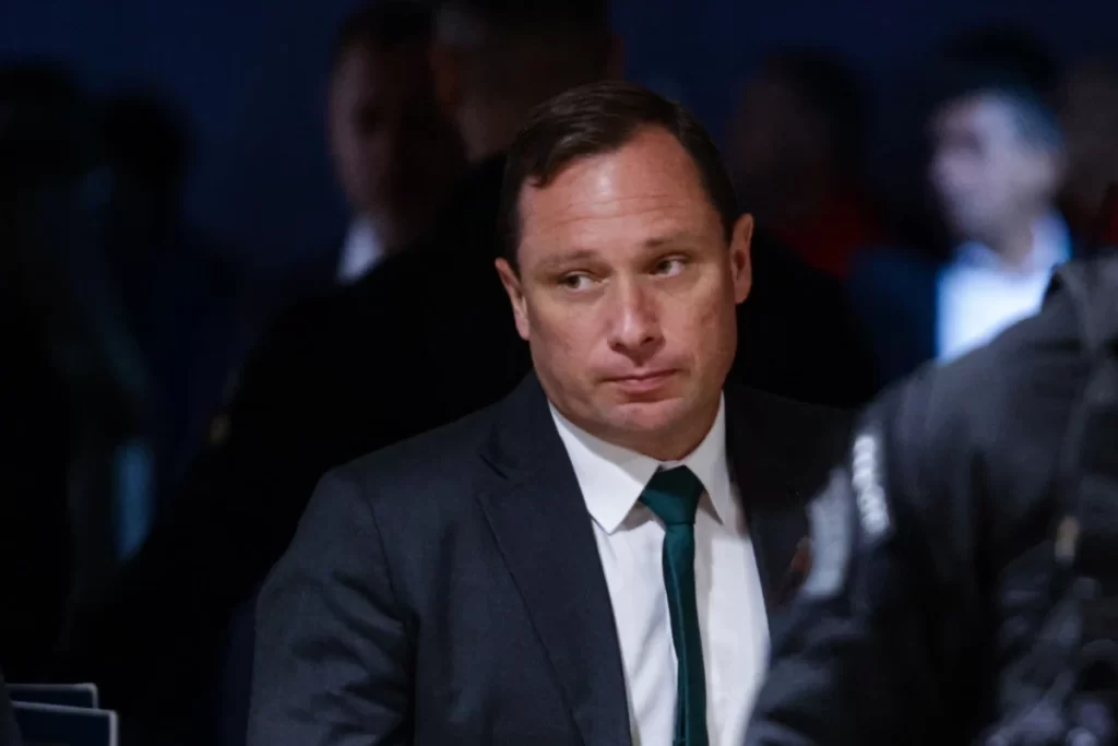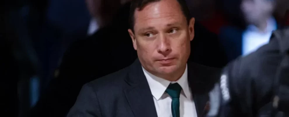 Homem de terno escuro e gravata verde escura olha para o lado com expressão séria. Pessoas desfocadas ao fundo.