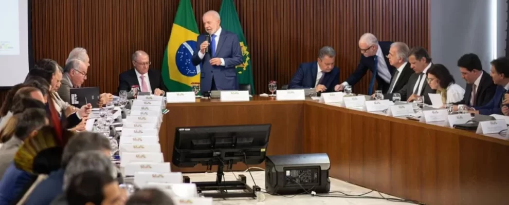 Presidente Lula discursa em reunião com ministros e autoridades em sala com bandeiras do Brasil ao fundo.