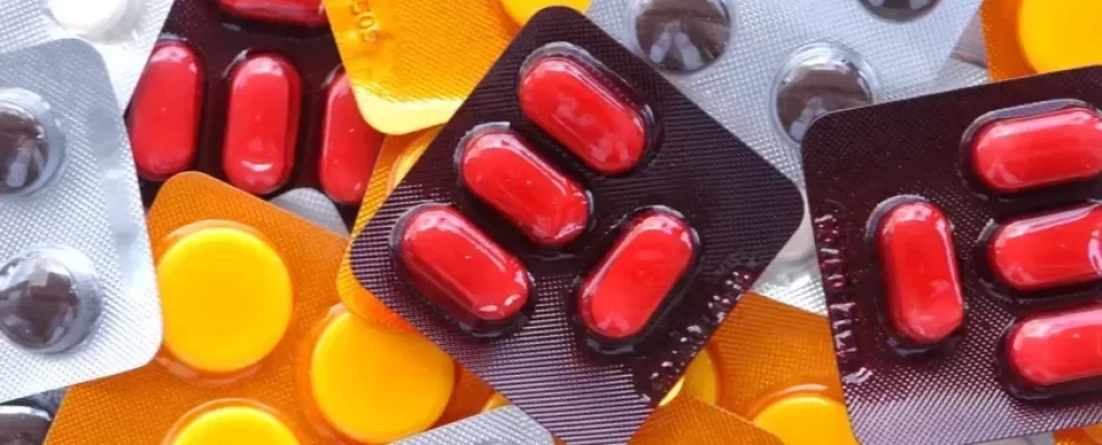 Embalagens de comprimidos e cápsulas vermelhas e amarelas em close-up, com algumas embalagens prateadas ao fundo.