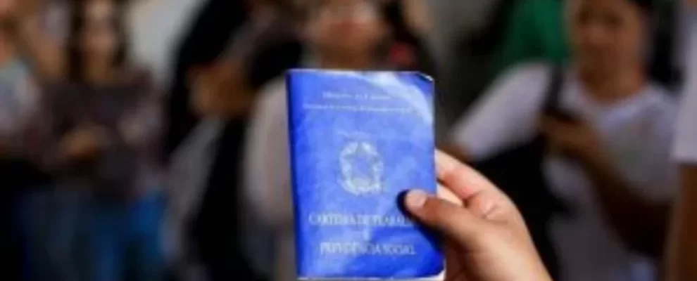 Mão segura carteira de trabalho azul com brasão da República Federativa do Brasil em destaque. Pessoas desfocadas ao fundo.
