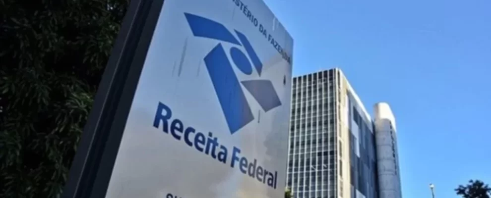 Placa da Receita Federal em frente a um prédio governamental em dia de céu azul claro.