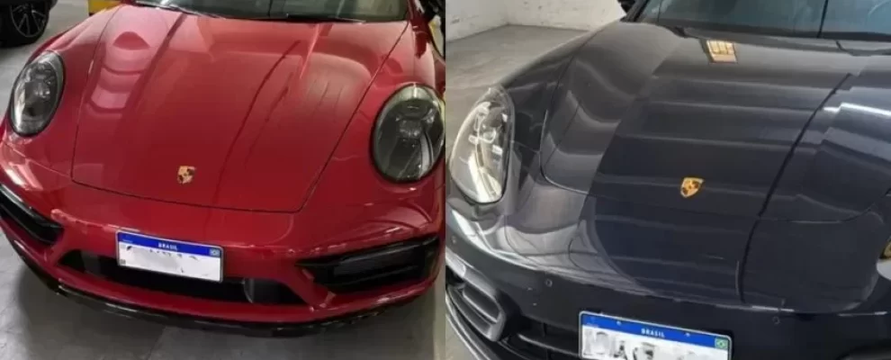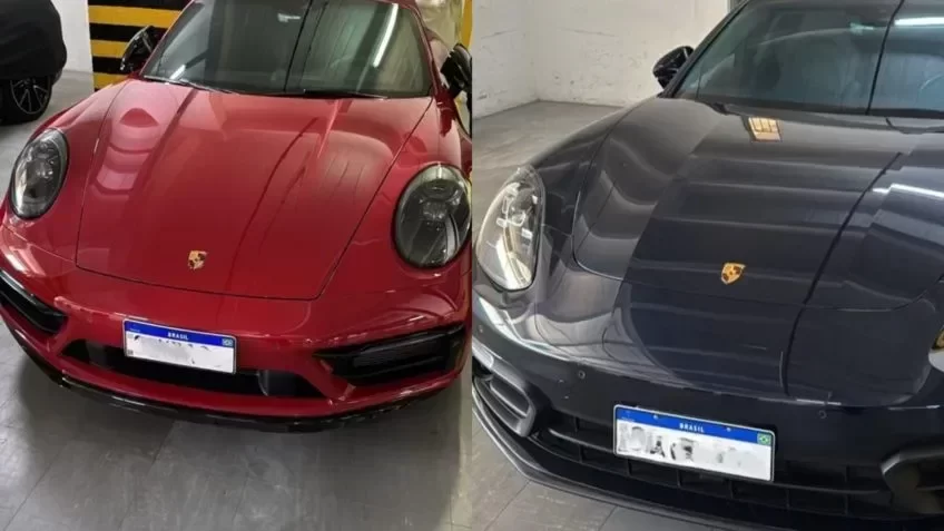Dois carros Porsche, um vermelho e um azul escuro, estacionados lado a lado em uma garagem. Ambos exibem placas do Brasil.